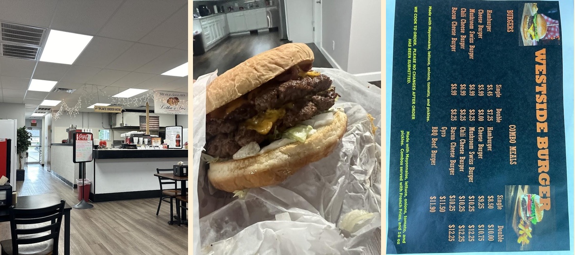 The menu highlights local flavors with an emphasis on quality ingredients. Guests can select from cheeseburgers, chicken sandwiches, or treats like the famous fried pickles. Westside Burger & Grill is the perfect spot for quick lunches or laid-back dinners with friends and family.